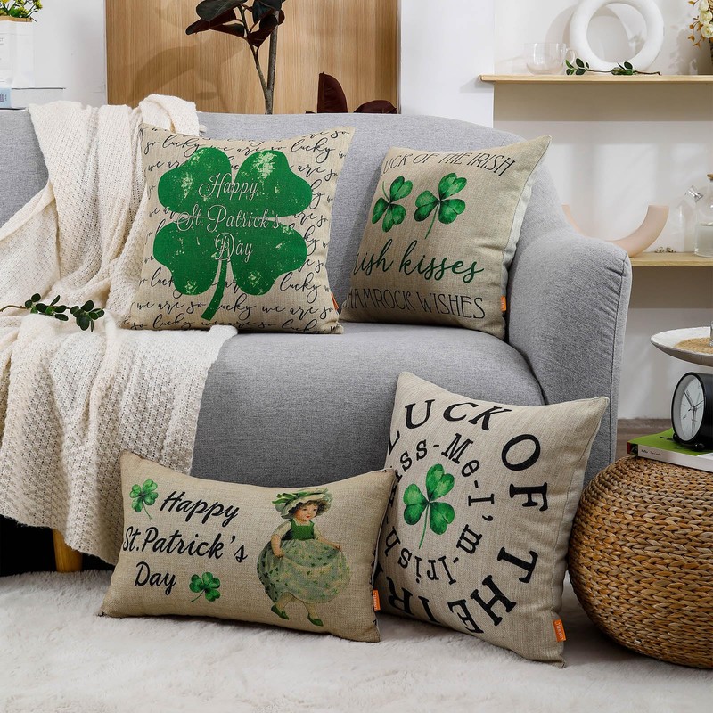 - CHARMING ST. PATRICK'S DAY DESIGN: This st patricks day pillow cover features two shamrocks and the phrases Luck of the Irish, Irish Kisses, and Shamrock Wishes, bringing festive cheer to any space.
