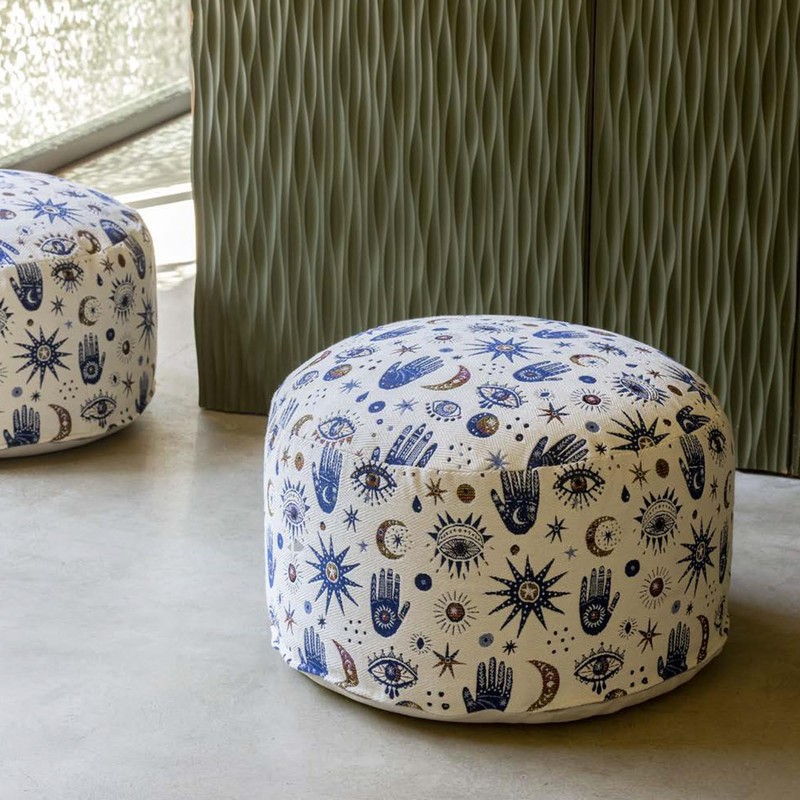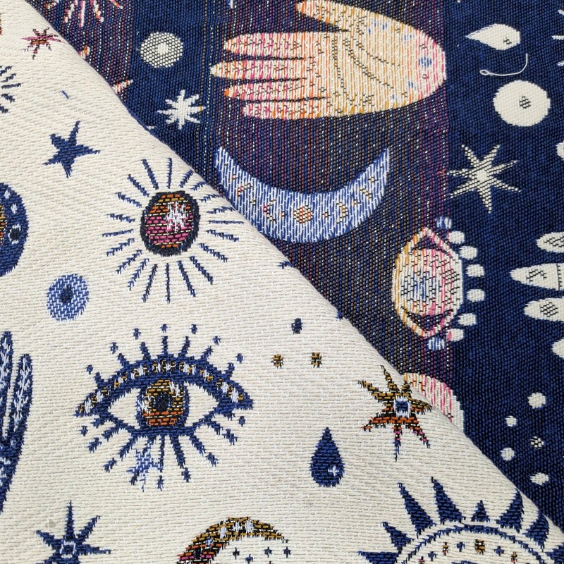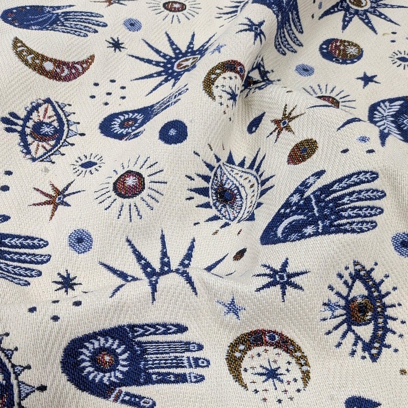 - ✔️ Jacquard-Stoff aus 72 % Baumwolle und 28 % Polyester (492 g/m²) mit blauem mystischem Muster auf weißem Grund. Ideal für Kissen, Sitzsäcke oder Vorhänge. Er vereint Halt, Weichheit und Originalität mit seinen Mondsymbolen und spirituellen Symbolen.