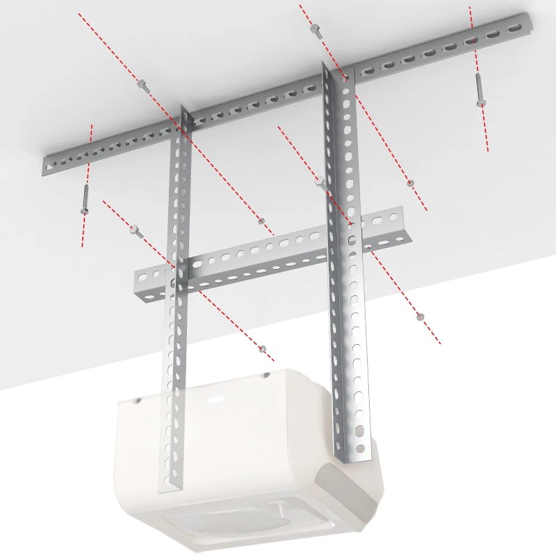 Universal - This garage door opener hanging kit is universal for hanging anybrand of garage door opener(Note: Measure your door's backset, cross bore andthickness to ensure you find the right fit) Porous Angle - Heavy-duty angleiron and reinforced brackets ensure that your garage door is safely andsecurely mounted on brackets that allow you to safely hang your new garagedoor opener from the ceiling! Easy Installation - The garage door mounting kitis easy to install, easy to adjust the position using the pre-punched holes,or you can cut the angle as needed to fit the need Quality Metal - Our garagedoor bracket replacement kits are made of alloy steel which is durable toensure durability and longer service life Package Includes - (1) 26” ceilingbracket, (2) 19-1/2” suspension brackets, (1) 13-1/2” cross brace, (1) 20”door bracket and accessories