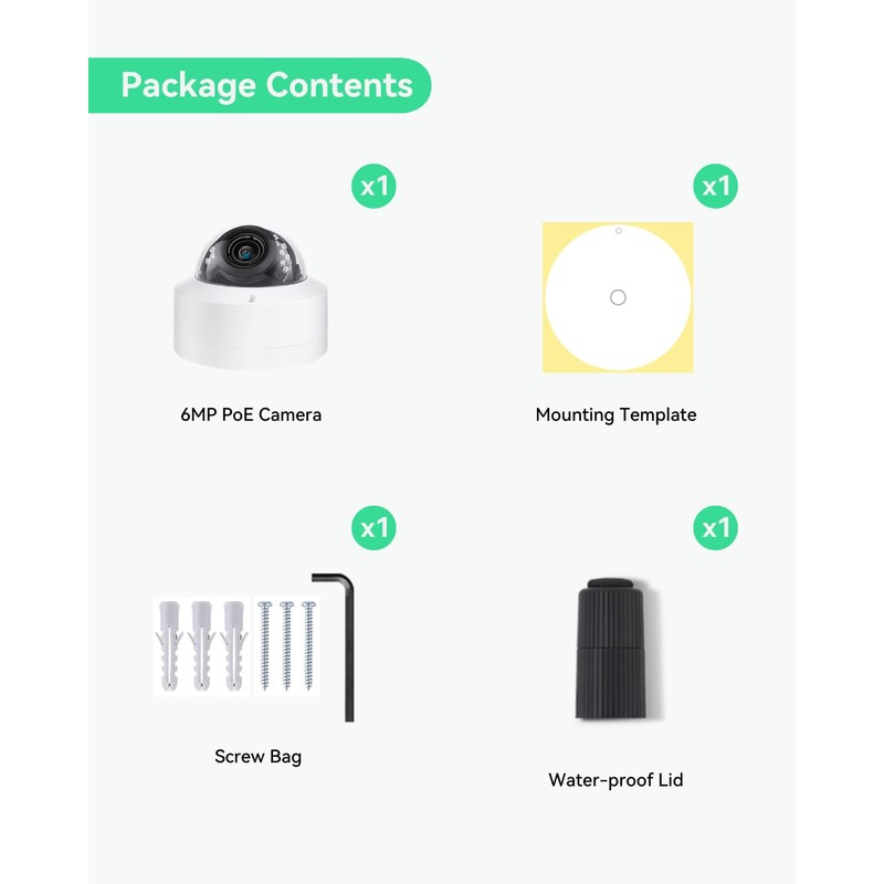 This vandal-proof dome POE IP Camera features with IMX335 low light CMOS sensor output 6 Megapixels superior image quality and built-in microphone. It supports the advanced H.265 video compression which saves up to 70% storage space. 18 SMD IR LEDs for night view, distance up to 100ft. High quality metal housing enables both indoor and outdoor use for home and commercial surveillance security system with quick and easy installation.