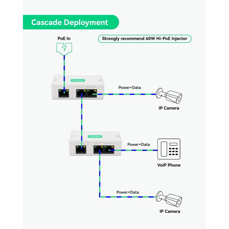 • 【UP TO 1,000FT POE + DATA EXTENTION】Extra 330ft POE+Data transmission will be extended with one Linovision POE Extender. And it supports two levels cascade deployment, therefore total 1,000ft POE + Data transmission is provided. (The 2nd POE Extender’s POE Input should be connected to the 1st POE Extender’s Out port, not Camera port)