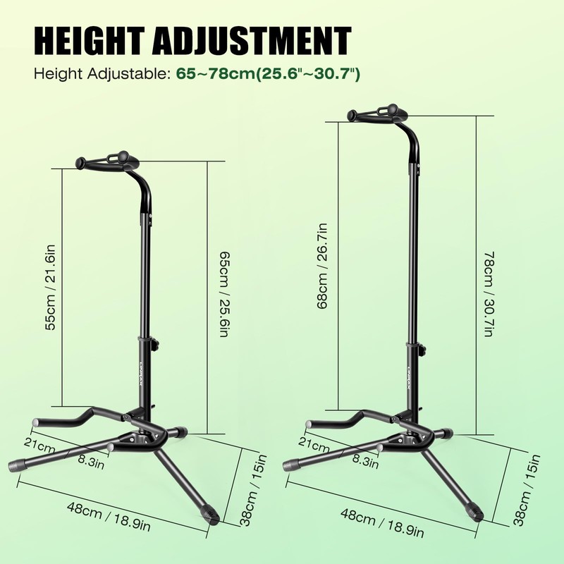 - 🎸【Adjustable Height】: Unlike other fixed guitar stand, this adjustable guitar holder features rotatable height adjustment (25.6” - 30.7”) to accommodate various guitar sizes.
