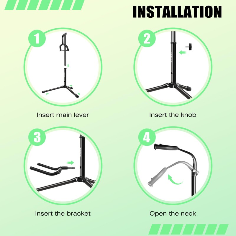 - 🎸【Durable & Stable】: Made from robust metal, the main structure is reinforced by full-round welding to withstand heavier musical instruments, we also strengthened the connection between the main lever and the bottom bracket for better use experience. 3 non-slip rubber feet provide a firm grip to avoid the folding guitar holder to move and cause the damage to the instruments.