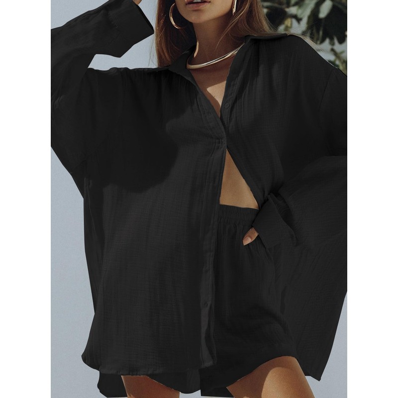 Linsery Shirt and Shorts 2 Piece Sweatsuit for Women Button Down Ruched Lapel Pajamas Set Black S