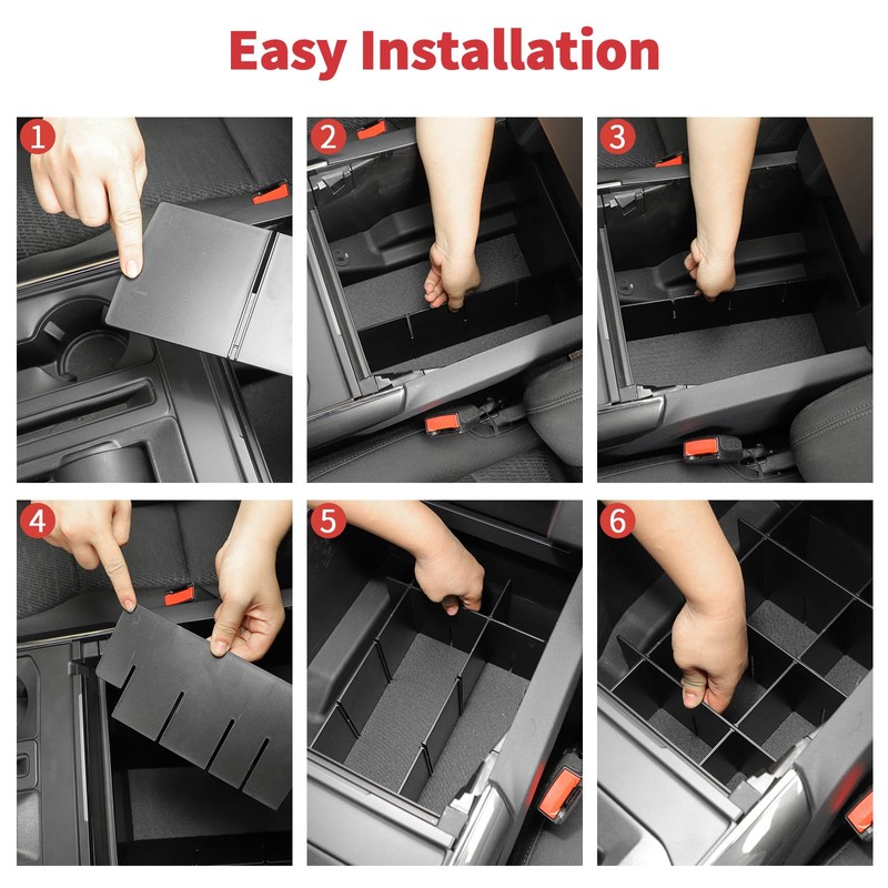 Installation instructions: Open the center console lid, align the divider with the slots inside, and gently press it into place — no tools needed.
