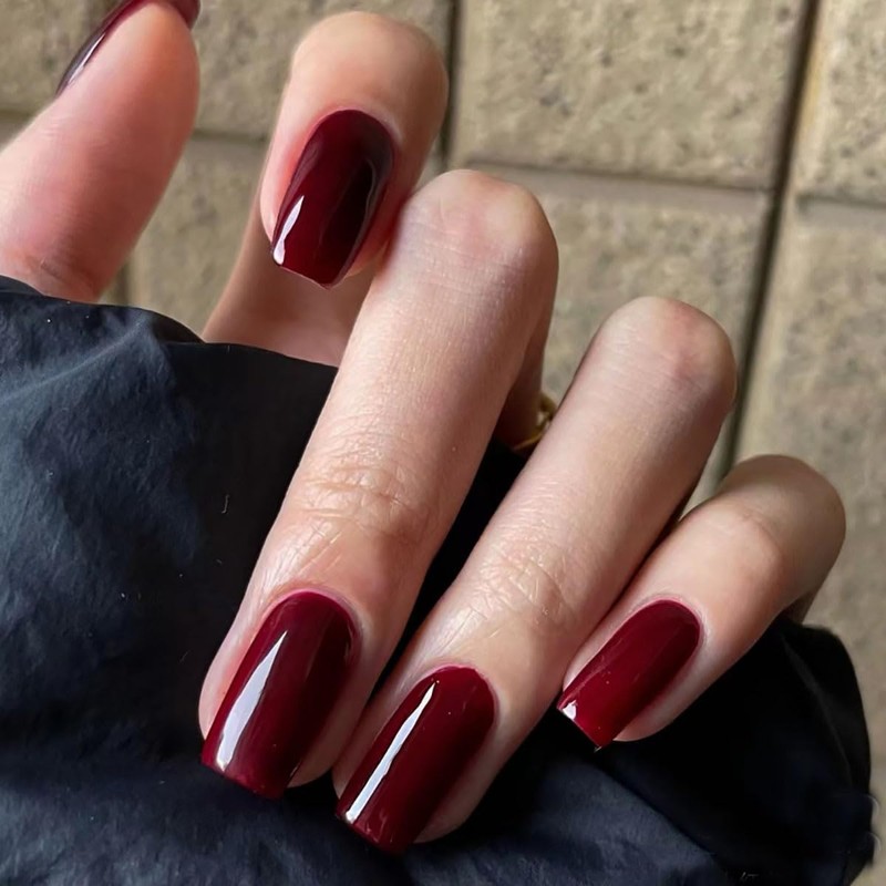- 1. Product Features-Medium length squoval shape press on nails, Glossy solid dark wine red gel false nails , make you more charming.