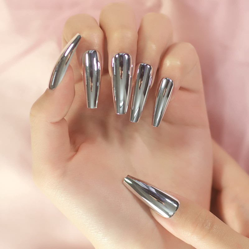 - 1.Product Features-Long coffin shape press on Nails, Silver metallic mirror false nails , make you more charming.