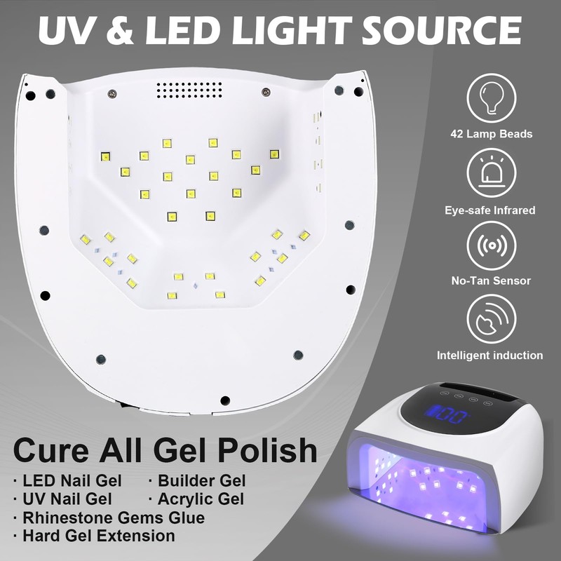 • Lámpara de uñas UV potente y segura: lámpara de uñas LED UV de 96 W con 42 cuentas duraderas, reduce el tiempo de curado en un 50% en comparación con una lámpara UV normal. Es seguro para uso humano y funciona con todos los geles