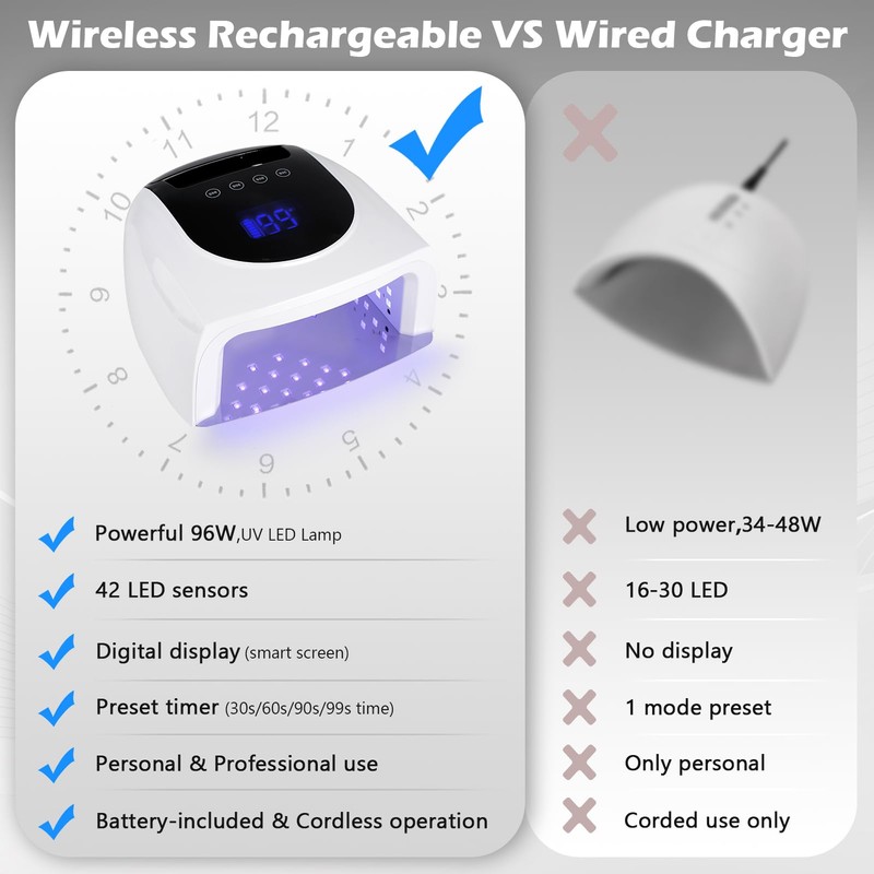Linssy Lámpara de uñas inalámbrica LED UV de 96 W, secador de uñas con 42 cue...
