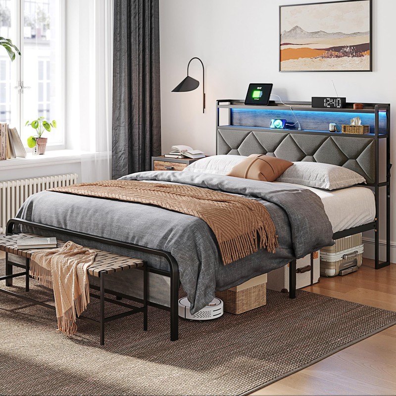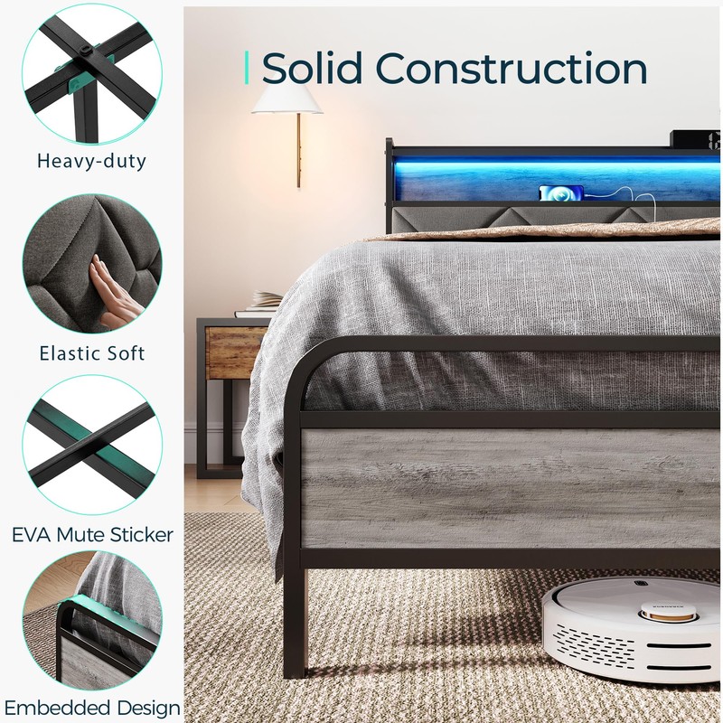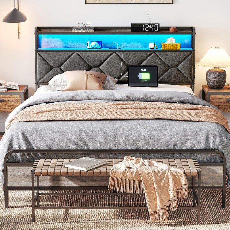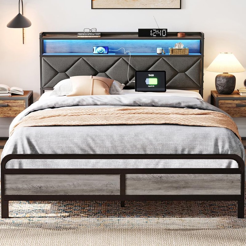 LINSY HOME Full Bed Frame, Upholstered Platform Frame with Storage Headboard, Metal Full Size Bed Frames with LED and Charging Station, No Box Spring Needed, Easy Assembly, Rustic Grey