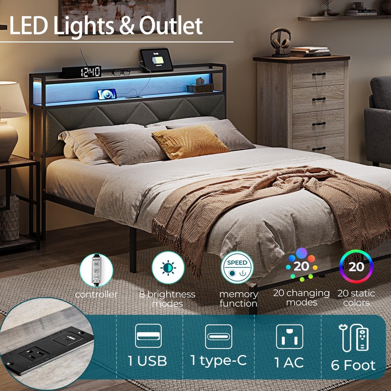 - * RGB LED LIGHT & CHARGING STATION: This bed frame supports the headboard RGB LED light. The light supports 20 vibrant colors, 8 brightness levels, and 20 dynamic modes. The controller is installed on the headboard, convenient to change the light when you are lying on the bed, you can easily set the perfect atmosphere for any occasion. The built-in charging station includes AC outlet, USB port, and Type-C port, making it easy to charge your devices while lying in this bed, no worry about the low!