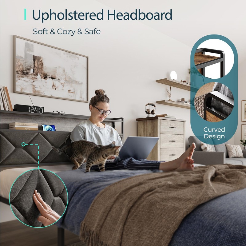 - * VERSATILE STORAGE SPACE: Designed with comfort and practicality in mind, this full bed frame features a headboard with 2-tier shelves that can hold small items like phones, books and decorations within reach, ideal for keeping bedroom essentials within easy reach. The 12.2" under-bed clearance offers extra storage space for luggage, shoe cases, and storage boxes, helping keep your room organized. The curved edges not only add elegance to the overall design but also enhance comfort and safety.