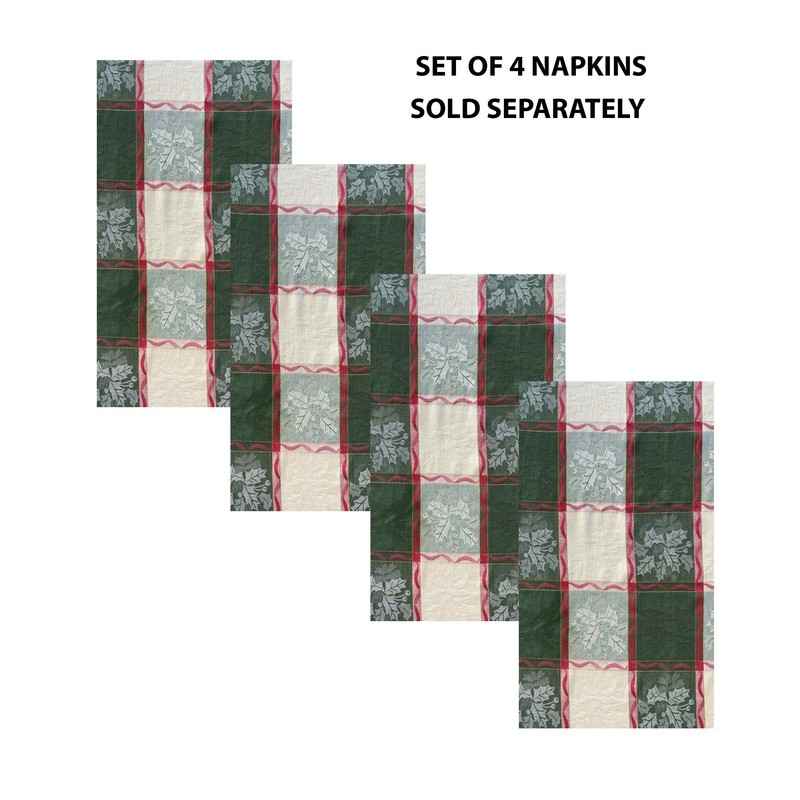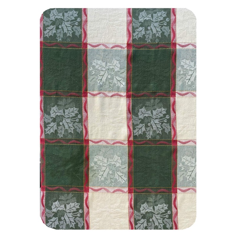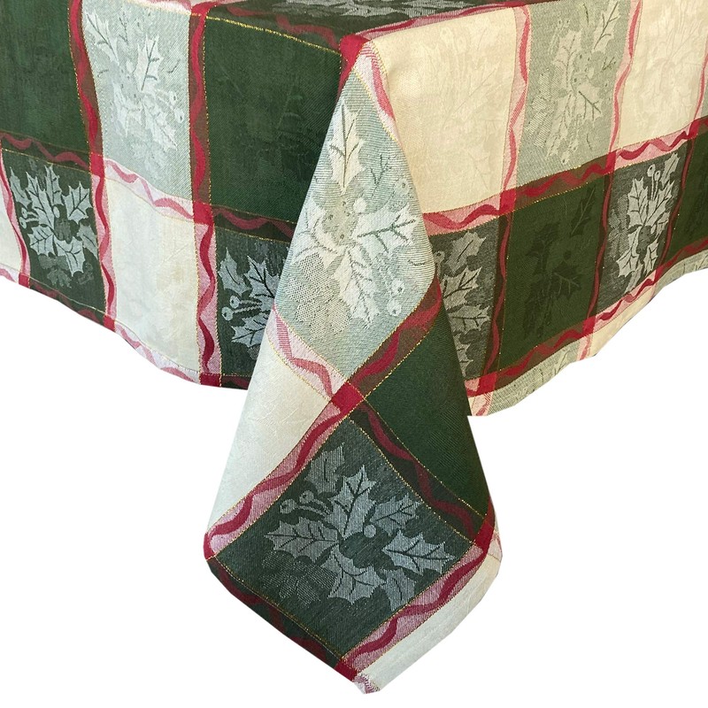 - STYLING: The Cottage styled Lintex Golden Mistletoe and Ribbon Cotton Jacquard Christmas Fabric Tablecloth features an allover large format woven plaid block pattern featuring alternating evergreen, and cream woven mistletoe surrounded by red swirling ribbons highlighted with gold lurex thread.