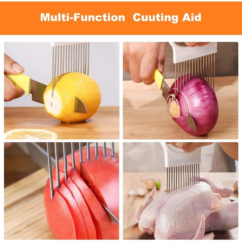 - Versatile Kitchen Tool: Multi-purpose kitchen gadget is good for slicing a wide range of foods. You can cut onions, lemons, cheeses, potatoes, tomatoes, apples, steaks, chicken, carrots. Onion holder for slicing can also doubles as a meat tenderizer, with sharp steel needles that penetrate deep into the meat to enhance its texture and flavor