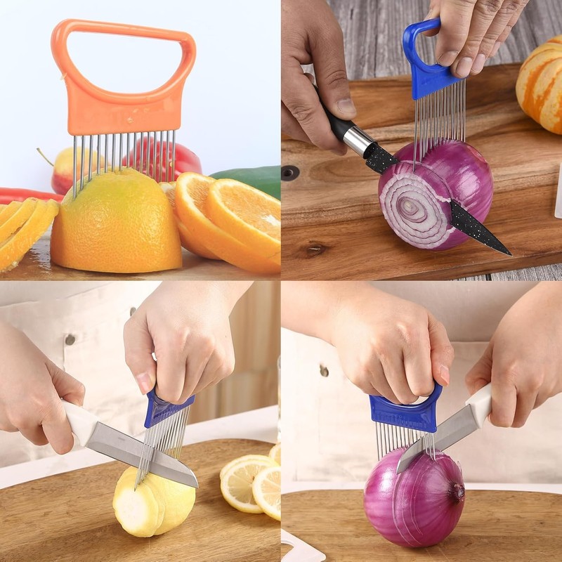 - Package includes: You will receive 3pcs onion slicer with protective cover, including green, blue and orange three colors.. Onion holder for slicing has a unique and compact design and can be easily stored even in a small space. Multi-purpose kitchen gadget is good for slicing a wide range of foods. Onion holder for slicing can also doubles as a meat tenderizer.