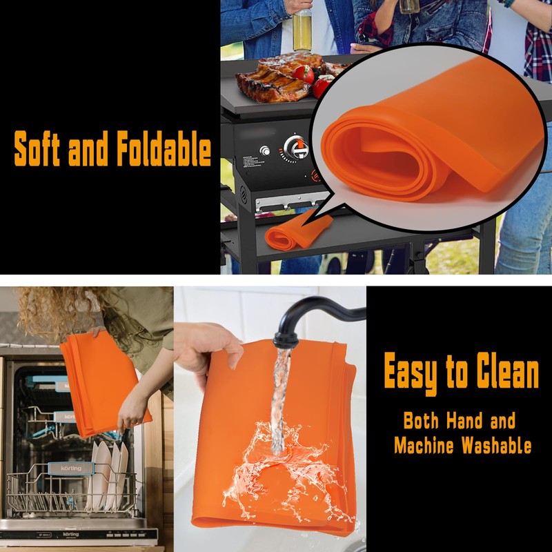 - 【Heavy-duty food grade silicone】:Our griddle mat for blackstone grill is made of 100% food-grade silicone,made of tough、thick and tightly fitting material,the safest material to protect the top surface of your blackstone griddle.
