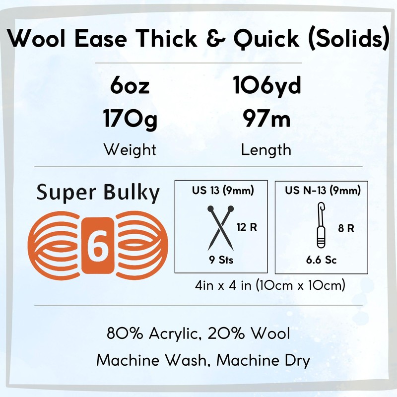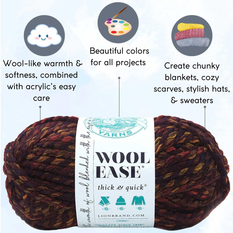 - Includes 3 skeins of Wool-Ease Thick and Quick Yarn - Harvest 640-622 yarn for knitting and crocheting and a 13x16 project bag. Feel the warmth and softness of wool with the easy care of acrylic. It is anti-split and fray-resistant.