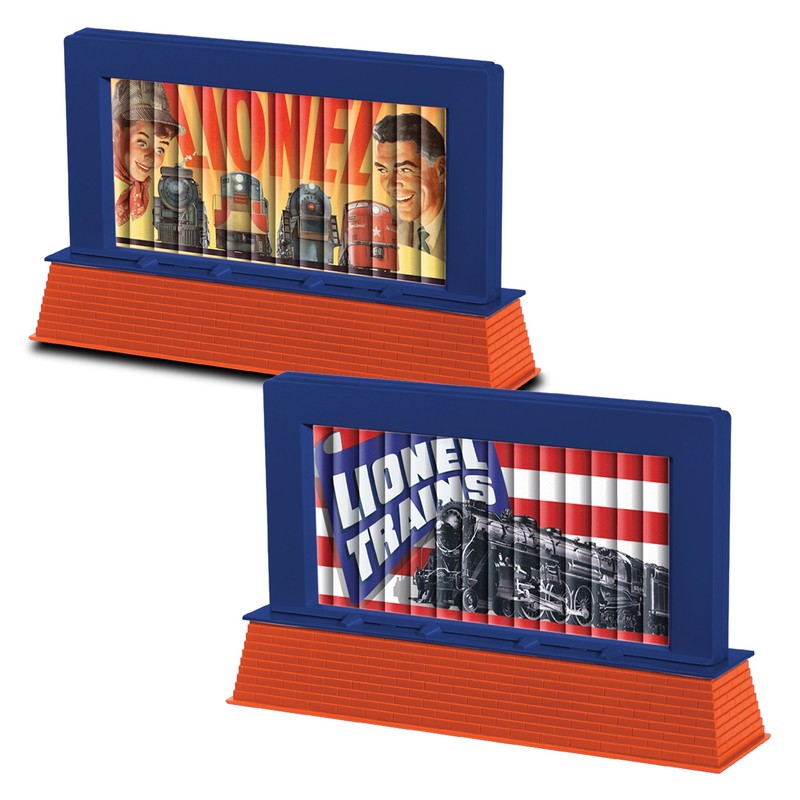 Lionel's Plug-n-Play Accessories features this billboard showing two classic catalogs from Lionel's Postwar past, switching between the two images when accessory is on!.