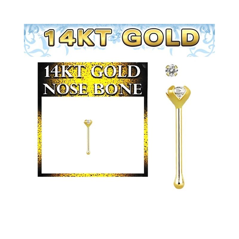 Nose Bone Micro Stud 14 Karat Gold 22g/0.6mm With A 2mm Round Prong Setting Clear Cubic Zirconia Non-Irritating Skin Safe Real Gold, Women And Men