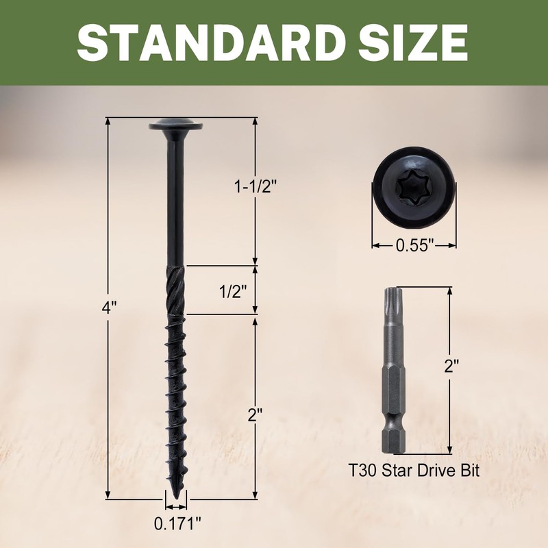 - 【DIMENSIONS & SUPERIOR STRENGTH】Thread Diameter 0.171" - Head Diameter 0.55" - Length 4" - Use with T30 Star Bit. Crafted from heat treated steel, our heavy duty lag screws ensure unmatched durability and reliability for long-lasting woodworking projects.