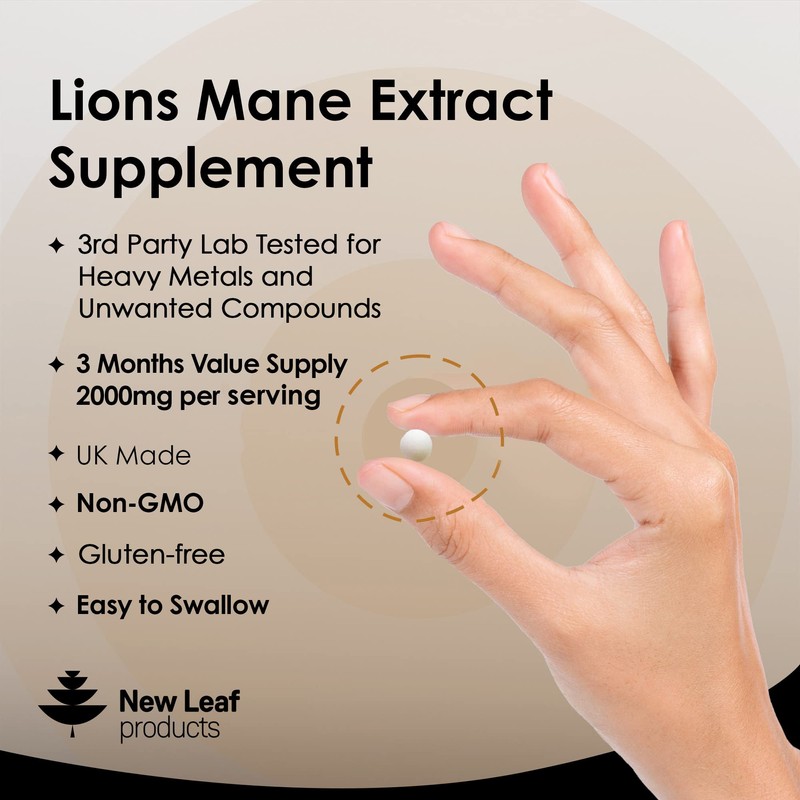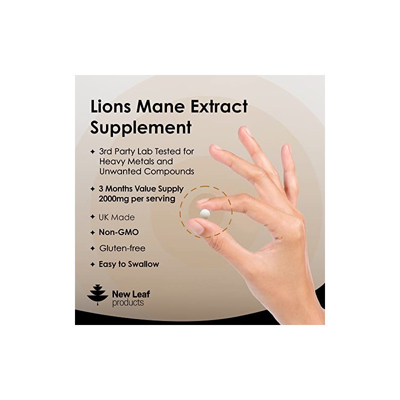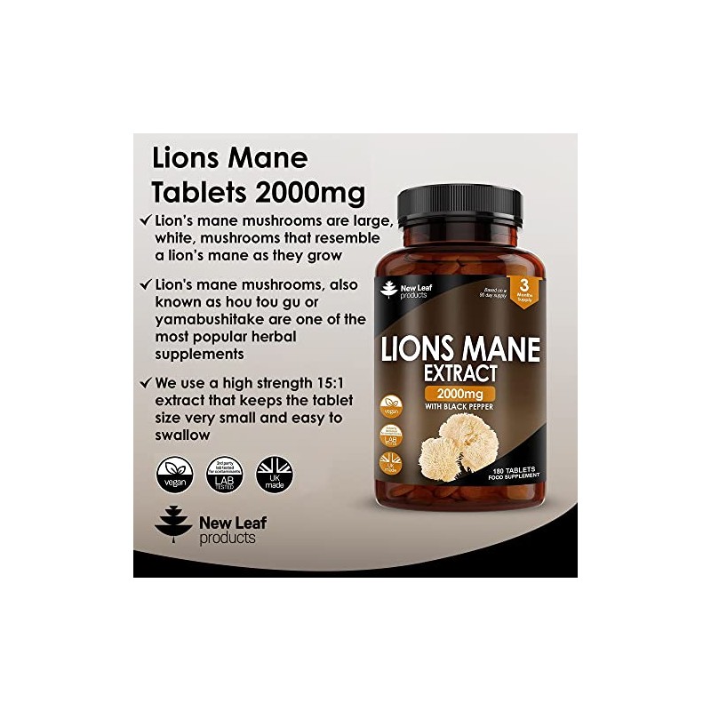 Lions Mane Mushroom 2000mg - 180 High Strength Vegan Tablets - Lion's Mane Supplement with Black Pepper - Lion's Mane Mushrooms Extract (Not Powder or Capsules) Made in The UK by New Leaf Products
