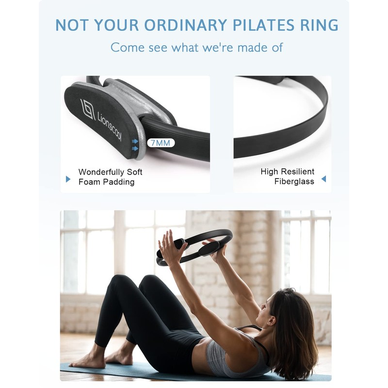 - Built to last: You don't need all of that bulky equipment to get started if you are new to Pilates. This 14-inch LIONSCOOL Pilates Ring is where the magic happens. It boasts high grade, resilient fiberglass encased in a thick rubber shell, which gives the ring a superior resistance and durability. It also features an unrivalled comfortableness thanks to the wonderfully soft, 7mm thickness foam padding on both inner and outer handles. Take your Pilates anywhere, anytime with this Magic Circle.