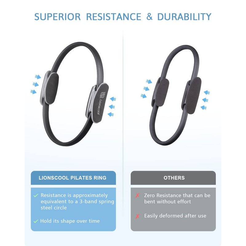- Resistance: Nobody wants to deal with a Pilates ring that has zero resistance. The LIONSCOOL Pilates Ring is about the same resistance as the 3-band circle made of spring steel. Our ring is appropriate for most users and for those who want to take things up a notch. But this resistance level is a little difficult for those who are just beginning a conditioning program after a long period of inactivity. So, listen to your body and feel the magic in every movement with LIONSCOOL Pilates Ring.