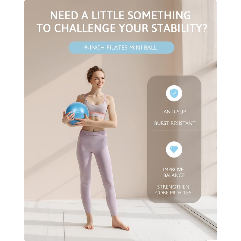- Pilates Mini Ball & Resistance Bands: The Mini ball is used more often in Pilates classes worldwide. Made from anti-slip, burst resistant PVC materials, the soft and squishy 9”exercise ball will challenge your stability and improve your balance. More than just a dreamy design, these highly durable latex bands featuring four resistance levels are the perfect addition to Pilates workout. You can include them in a mat or equipment routine to open up countless exercise possibilities.