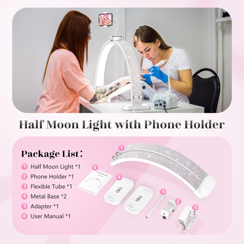 - 【Innovative Foldable Design & Phone Holder】 - Our half moon light for nail desk with mobile phone holder offers convenient portability, the base can be effortlessly attached and detached, eliminating the need for complicated screw installation. Our lash extension light is equipped with a phone holder(compatible with most smartphones). Great nail desk lamp ideal for lighting work of estheticians, tattoo artists, manicurists and other professional beauty workers.
