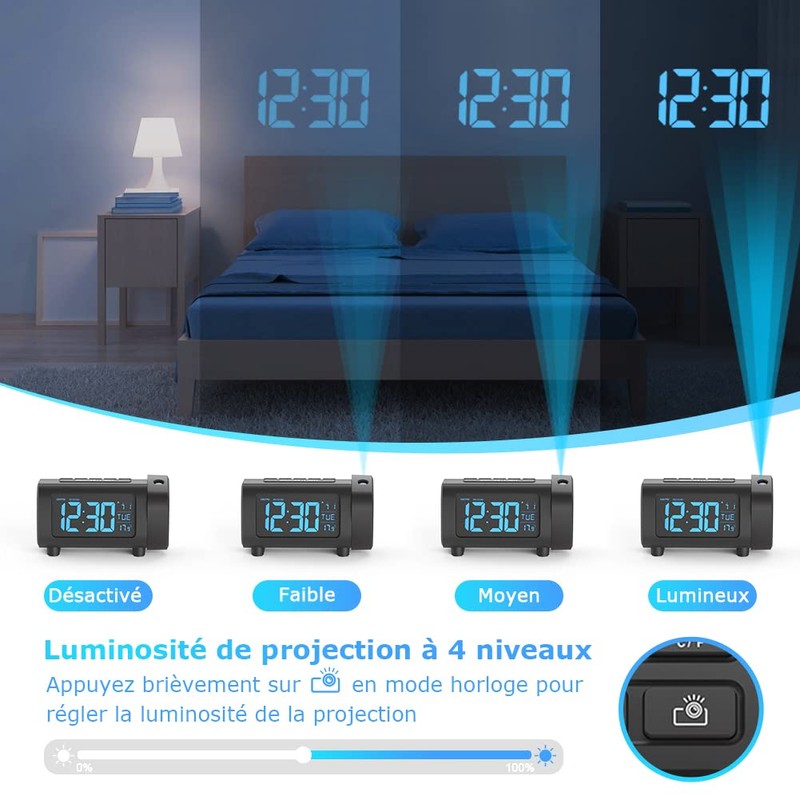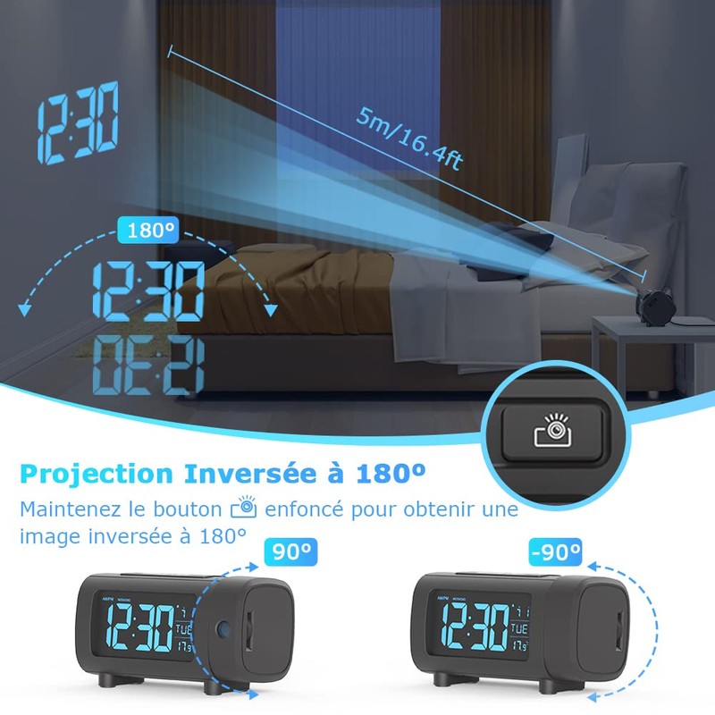 - [180° Projection Clock & Large VA Screen]:LIORQUE radio alarm clock with 180° rotating projector, the focus button allows projection distance of 0.5 to 5m from the wall or ceiling. Long press the "Project" button to rotate the projection view backwards. The VA display protects your eyes from too intense lights and also ensures a clear time display with 4 brightness levels.