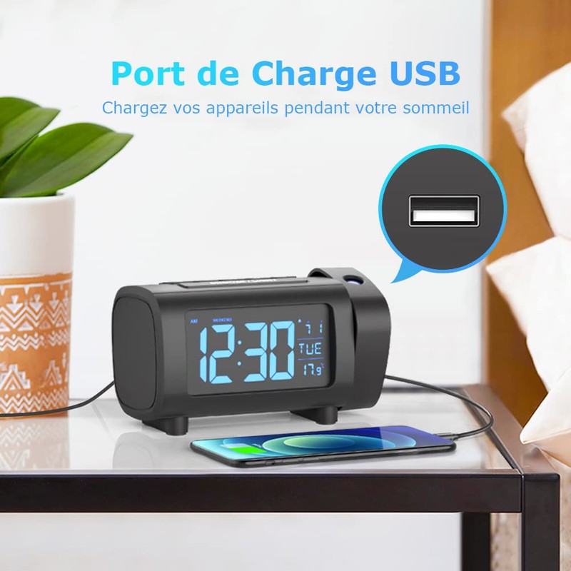 LIORQUE Radio Alarm Clock with Projection, Projection Clocks, 180° Alarm Clock, FM Projector with Alarm, Large VA Display, 4 Brightness Levels of Display, Digital, USB, Snooze Function, 12/24 Hours