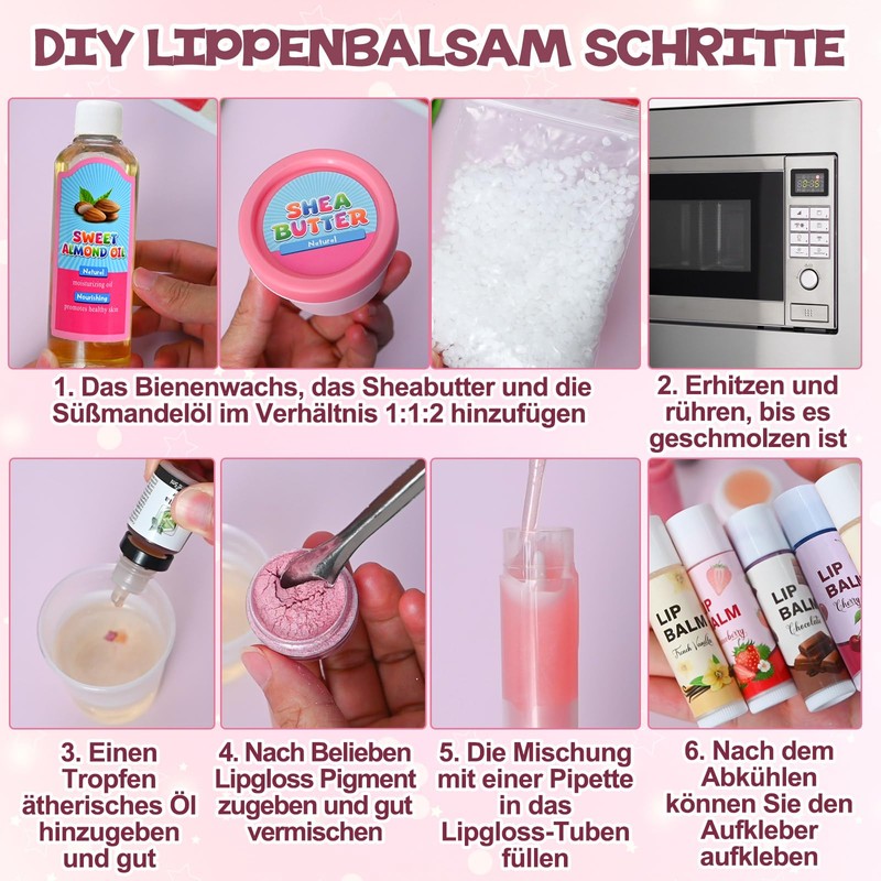 - The set contains enough material and simple instructions to guide you through making lip gloss in a safe and easy way at home, even if you have no experience