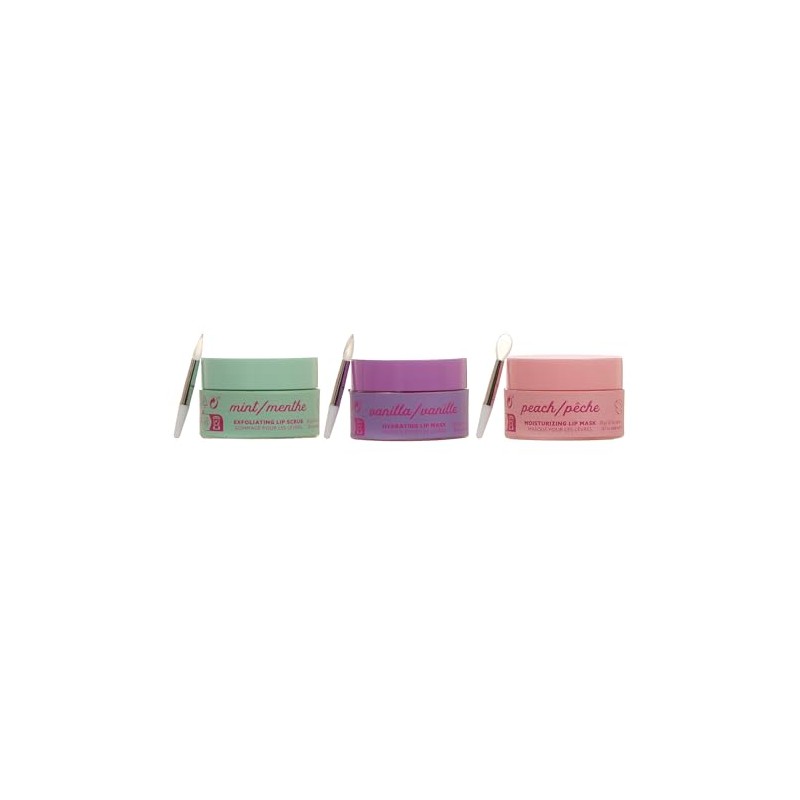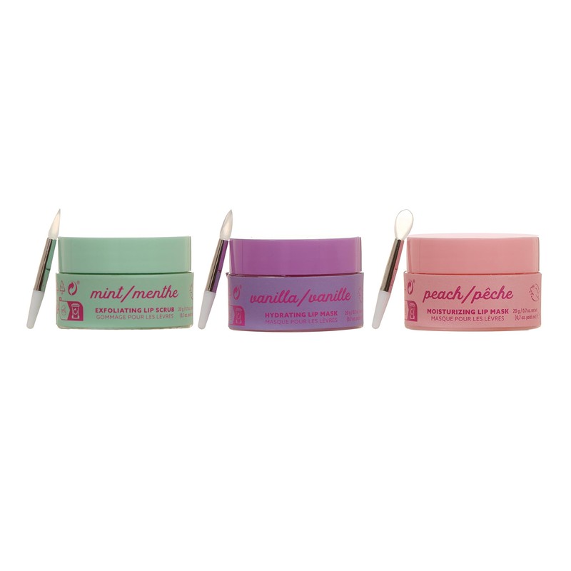 - Comes with 3 x 20g lip treatments: Exfoliating Mint, Hydrating Vanilla, Moisturizing Peach