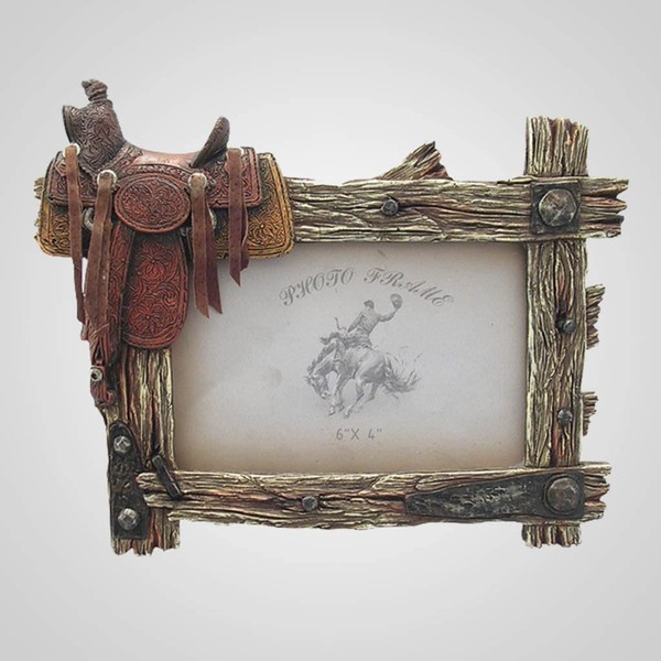 • Photo frame looks like old fence with a western saddle slung over it.