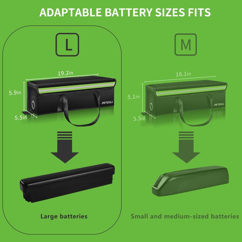 - đ„ăLarge capacity designă- Our battery packs come in two sizes: 16.1x 5.1x 5.5 inches for size M and 19.2X 5.5X 5.9 inches for size L. The large capacity is designed to protect your e-bike batteries, toy batteries, drone batteries, dry cell batteries, and various lithium batteries. Please measure the right size model for you before purchasing to ensure the perfect fit.
