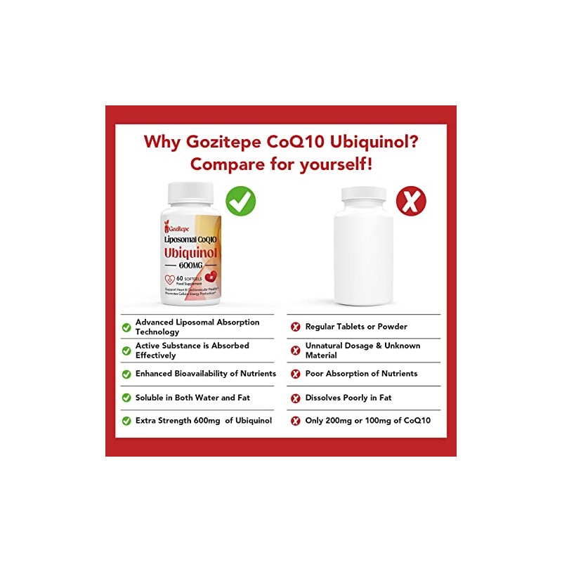 - WHY YOU NEED CoQ10? - CoQ10 is a naturally occurring nutrient-like coenzyme that plays an important role in the production of energy needed by our cells. Gozitepe Liposomal CoQ10 Softgels as a powerful antioxidant supplement that support heart and vascular health. what's more, it’s beneficial to statin drug users and is also the Cardiologist-recommended Gold Standard form of CoQ10. Taking this CoQ10 supplement is the best way to increase your natural CoQ10 levels and support heart health.