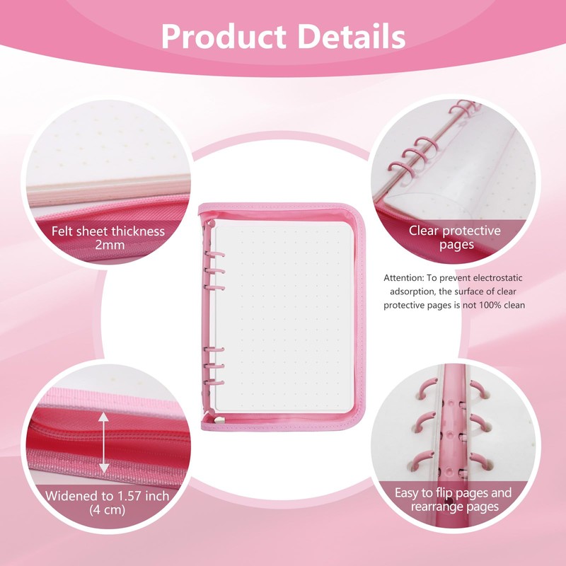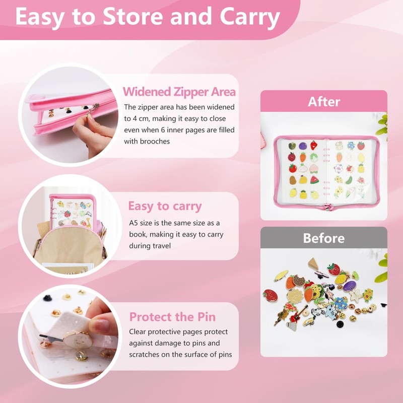 - Product Includes:The pin display book is a stylish and practical pin collection display. it contains 1 pink pin collection book, featuring with 6 Adjustable opening rings, with 6 white pin storage felt binder pages and 6 clear protective pages
