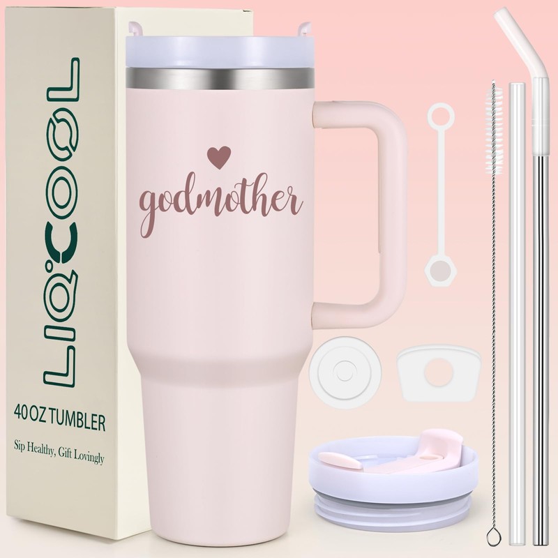 LiqCool Godmother Proposal Gift, 40 Oz Godmother Tumblers, Godmother Christening Gift from Godchild, Will You Be My Godmother Christmas Birthday Gifts for Godmother(Pink)