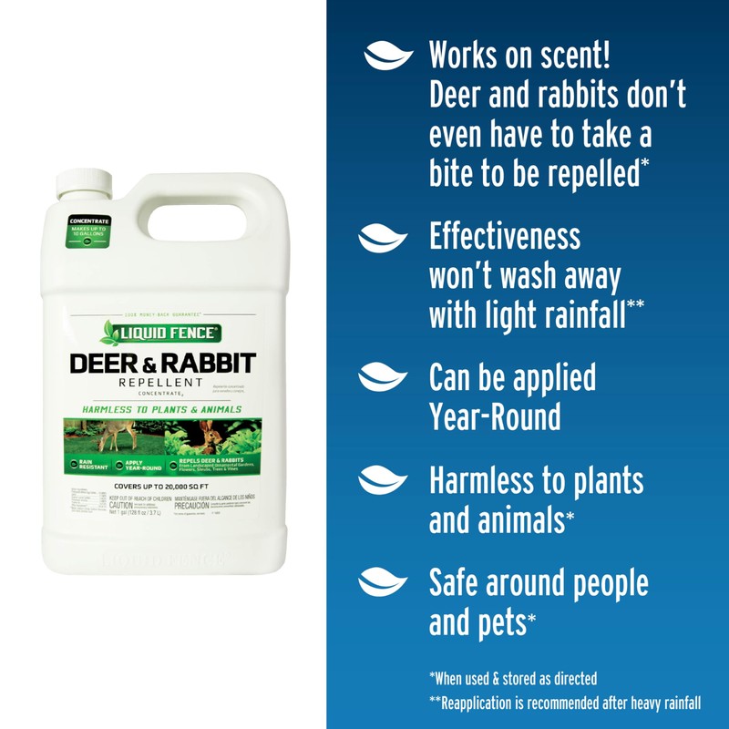 - APPLY YEAR-ROUND: No need to rotate with other repellent brands – animals' natural aversion to Liquid Fence Deer & Rabbit Repellent2 will never diminish