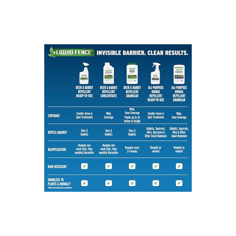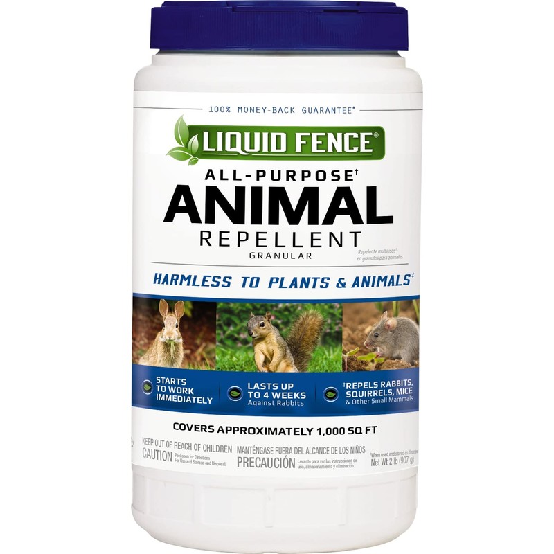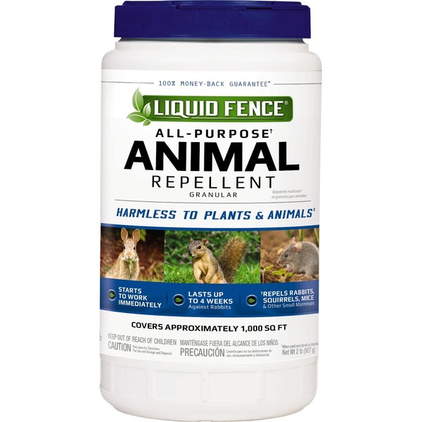 Don't let animals have the pick of the garden before you can. Deer, rabbits, moles and other four-legged pests enjoy your lawn and landscape as much as you do – hit them in the nose so they won't come back. Liquid Fence animal repellents use scent- and taste-deterring formulas that won't harm animals or plants when used as directed. Invisible barrier. Clear results. Liquid Fence all-purpose animal repellent granular creates an invisible barrier against animals like rabbits, squirrels, mice and other small mammals. This rain-resistant formula starts to work immediately, and it's safe to use around pets, kids and wildlife, when used and stored as directed. This product repels rabbits up to 4 weeks and is safe to use around edible plants, when used and stored as directed. Apply in your yard, landscape and garden. Shake these granules evenly around the treatment area and reapply as needed. In areas where animal activity is intense, additional and/or heavier applications may be needed. When applying to edibles, thoroughly wash crops before eating; for leafy vegetables, remove and discard the outer layer of leaves and rinse thoroughly. See product label for complete directions for use.