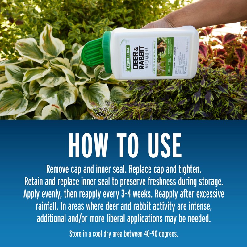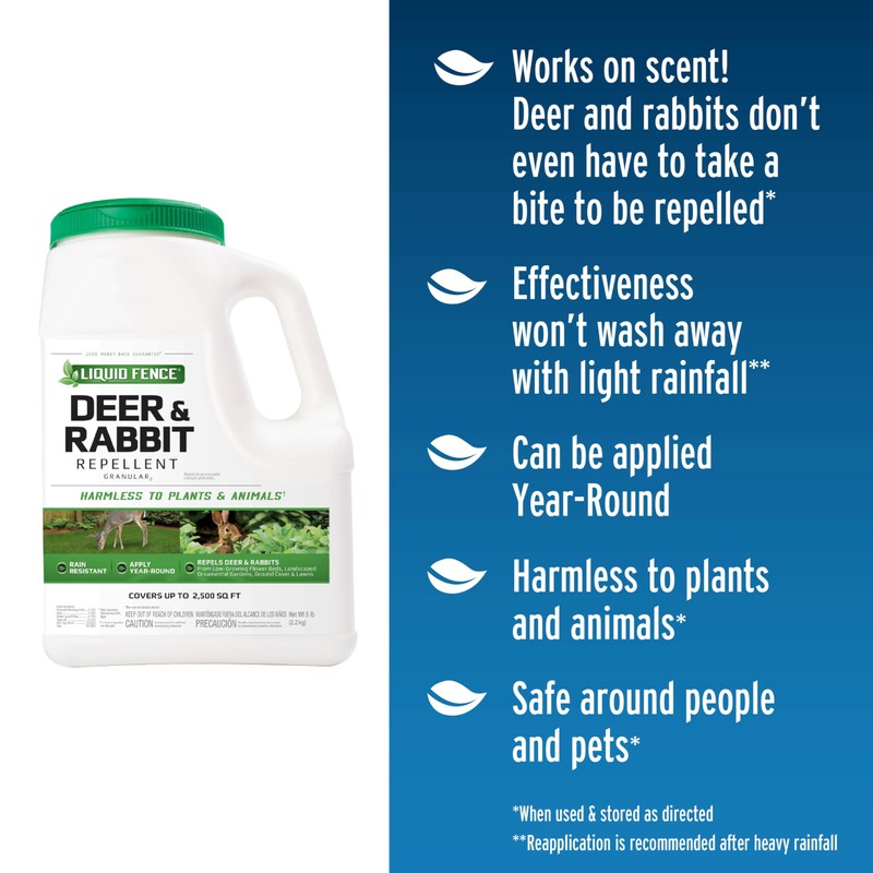 Don't let animals have the pick of the garden before you can. Deer, rabbits, moles and other four-legged pests enjoy your lawn and landscape as much as you do C hit them in the nose so they won't come back. Liquid Fence animal repellents use scent- and taste-deterring formulas that won't harm animals or plants when used as directed. Invisible barrier. Clear results. Liquid Fence Deer and Rabbit Repellent Granular2 repels deer and rabbits before they feed! This granular formula repels deer and rabbits from low-growing flower beds, landscaped ornamental gardens, ground cover and lawns. The repellent works on scent, so deer and rabbits don't have to take a bite to be repelled. It is harmless to plants and animals when used and stored as directed, and can be applied year-round. The formula is rain resistant. Animals' natural aversion to this scent will never diminish C this product does not have to be rotated with other repellent brands. Reapply every 3 to 4 weeks. Reapplication is recommended after excessive rainfall. In areas where feeding pressure from deer and rabbits is intense, additional and/or more liberal applications may be needed.