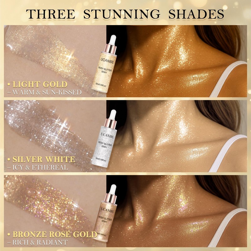 - Glow That Shines Anywhere – Liquid glitter highlighter designed for both face and body, giving a radiant glow from cheekbones to shoulders.