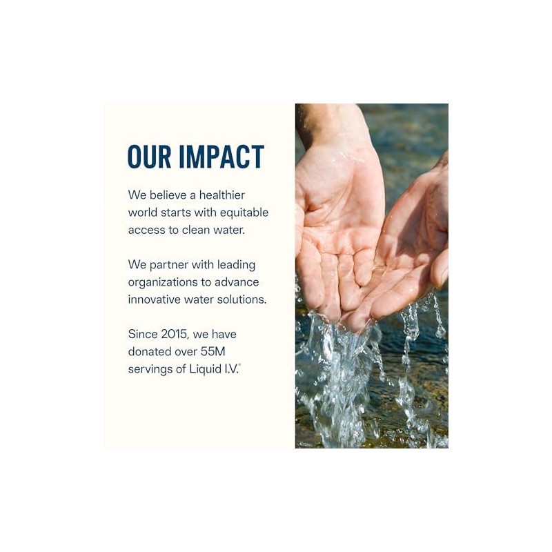 • HYDRATION AID: Since 2015, we have donated over 55 million servings of Liquid I.V. to those in need around the globe, and donate over 1% of our revenue to our Impact programs.