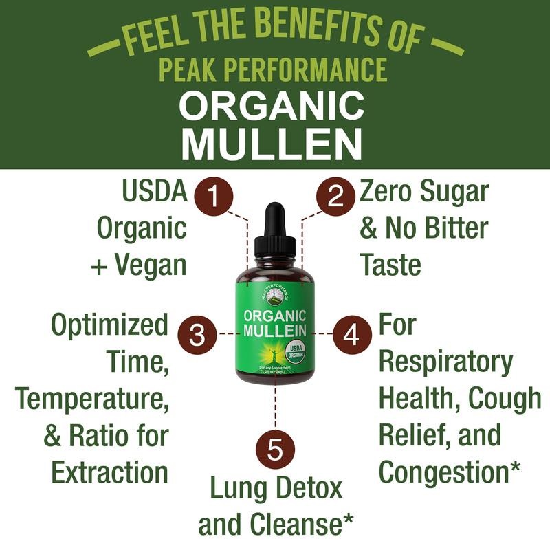Peak Performance Organic Mullein Leaf Liquid Drops – Your natural solution for respiratory support and lung health. These USDA-certified organic drops provide a highly bioavailable, gentle herbal tincture that can be easily mixed into tea, juice, milk, or water.
