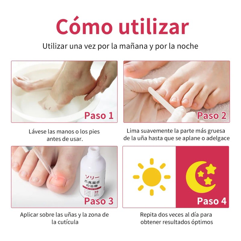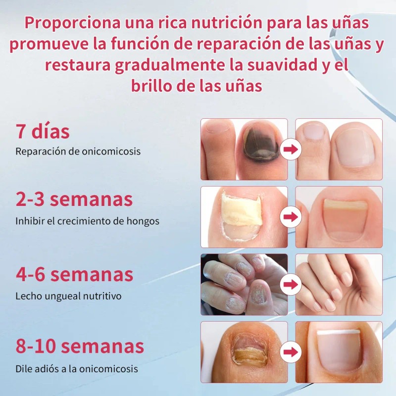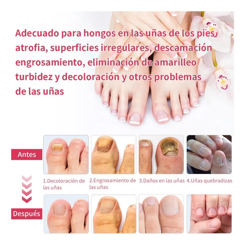 Pero eso no es todo. 💖 Nuestro líquido no solo elimina los hongos, sino que también repara y fortalece tus uñas, devolviéndoles su brillo y vitalidad natural. Observa cómo, día tras día, tus uñas se vuelven más fuertes, más sanas y más hermosas. 💅 ¡Prepárate para lucir unas manos y pies impecables y para recibir miradas de admiración! 🤩