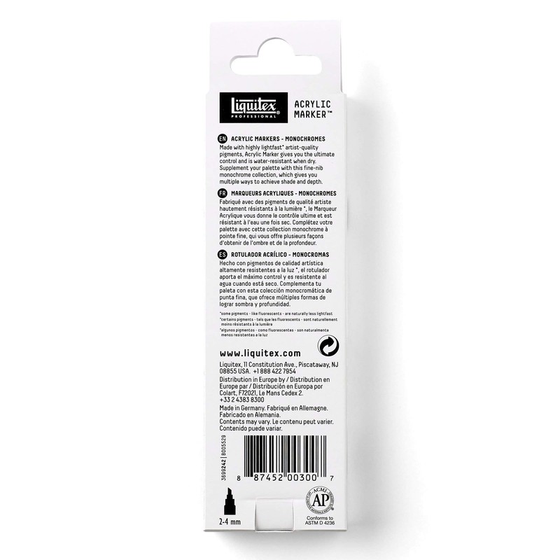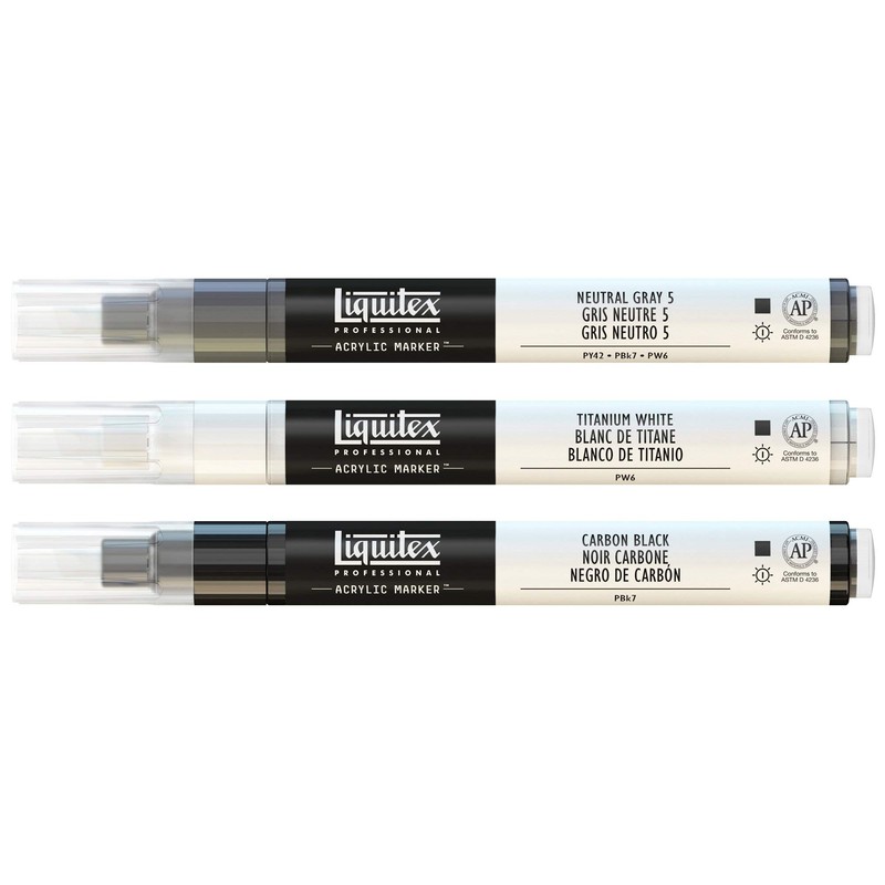 Liquitex paint markers are each made from super-fine artist-grade pigments and give you a huge range of bright, lightfast shades versatile enough to stand up and be Counted on almost any surface. Precision nibs make them ideal for fine- line detail and sketching. Set includes carbon black, Titanium white, and neutral grey 5.