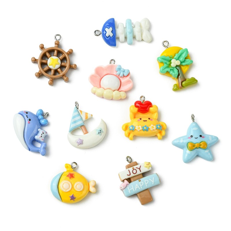 Ocean-Inspired Designs: Dive into creativity with our ocean theme charms collection featuring whale, sailboat, anchor, starfish, crab, shell, tree, and submarine designs—perfect for crafting trendy accessories.