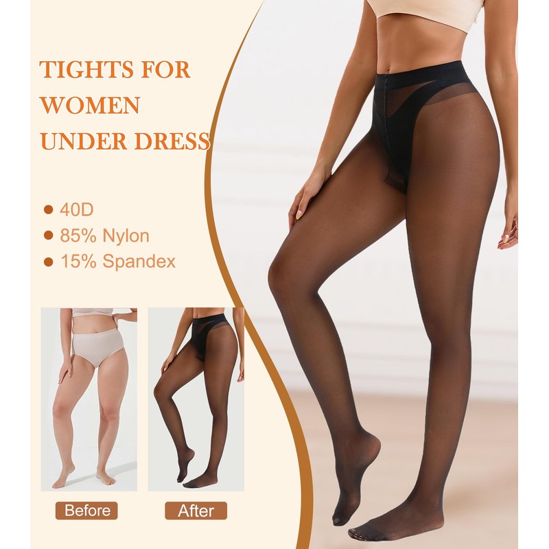 - 【SEAMLESS TIGHTS】 The Sheer Tights for Women made of 85% Nylon and 15% Spandex. It's super thin, and provide a no-show look under clothes.