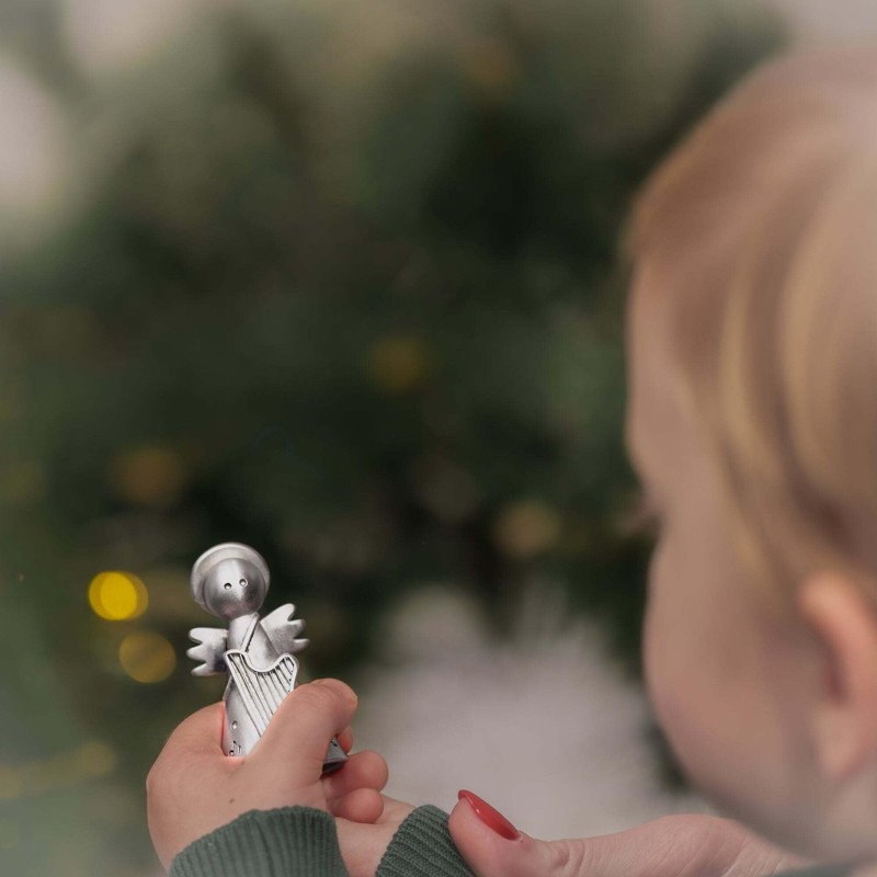 - This little angel is making music and reminding us that JOY has come to the world. Christ is born! Add this angel to your Christmas nativity set and create lasting memories each year. The Angel is hand-molded and cast in fine pewter, and measures 2.5" tall x 1-1/4"