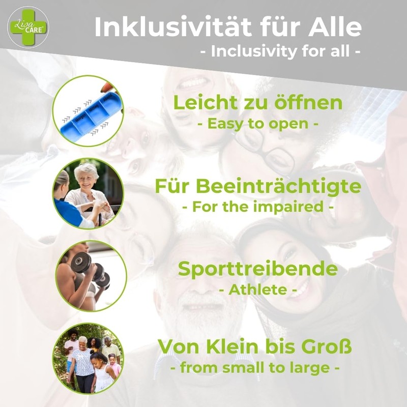 - Box contents and Lisacare – we supply you 1 x tower organiser with 7 individual doses (every day of the week with 4 compartments) for your tablets, medications, supplements, dietary supplements etc. Possibilities! - Why LisaCare? ✓ Small company from NRW. ✓ We are a training company. ✓ Social commitment to various projects. Permanent contact option in case of ambiguity"